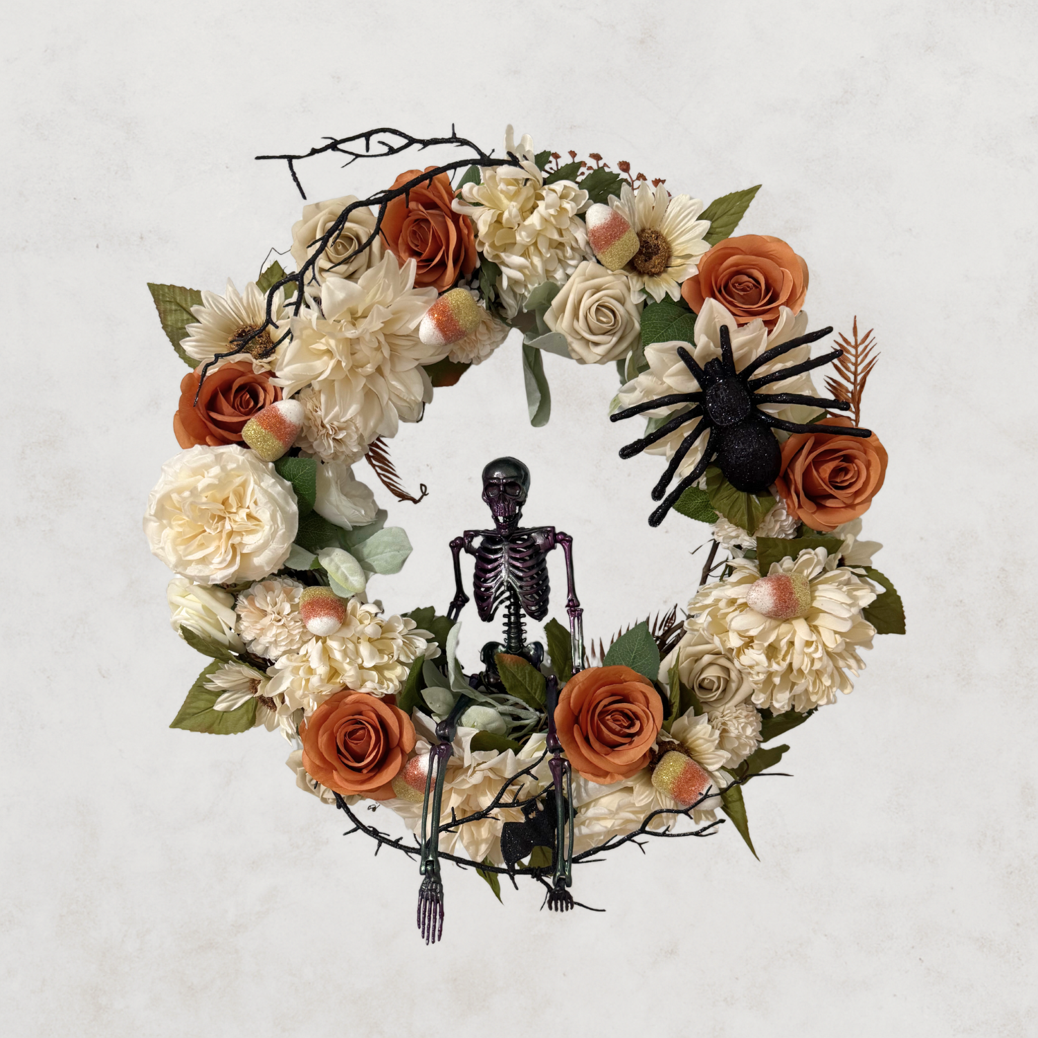 Accented with a black glittered spider and a mini metallic skeleton sitting between floral clusters, this wreath strikes the perfect balance between chic and spooky. Black twig details, candy-corn inspired accents, and autumn foliage give it texture and depth, making it an eye-catching addition to your entryway, mantel, or interior decor.